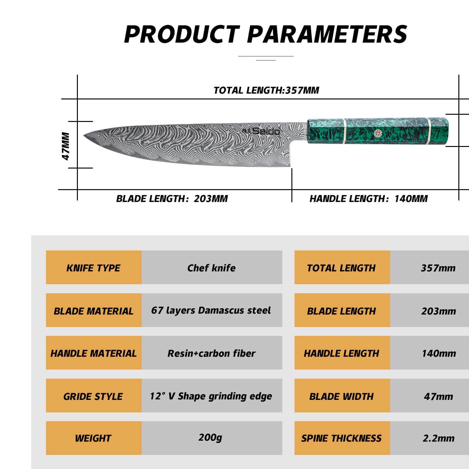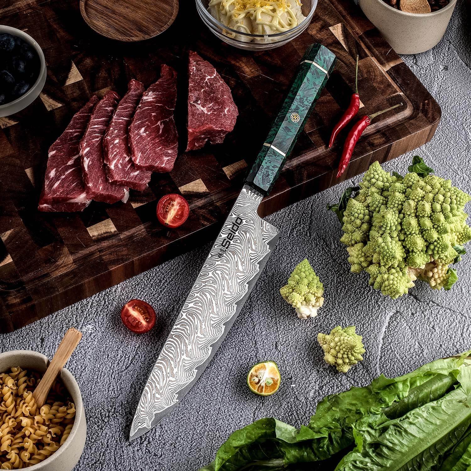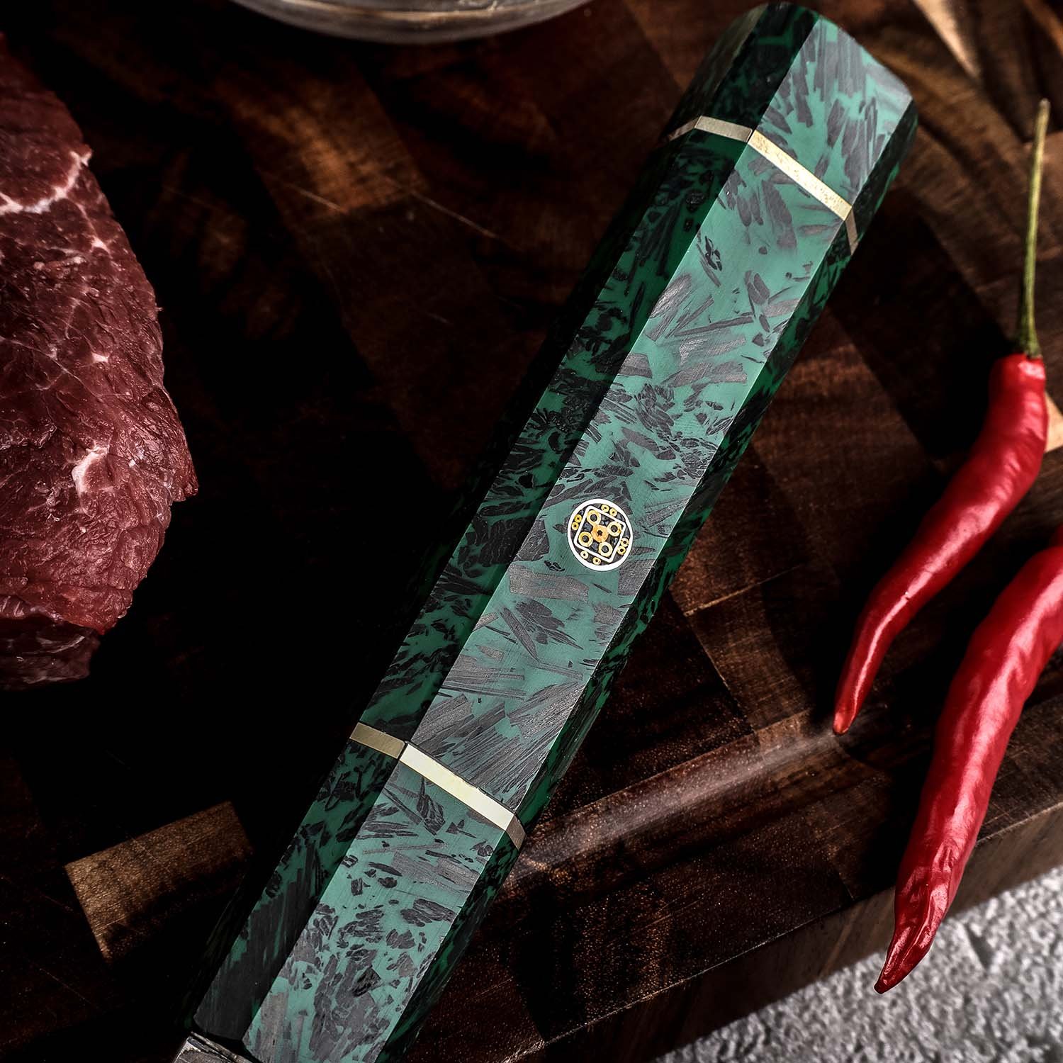 The knife’s handle. crafted from elegant green resin and carbon fiber. not only adds a sophisticated touch but also provides a comfortable. secure grip. Designed for superior balance and precision. the Epokishi Gyuto Chef Knife enhances your cooking experience. combining top-tier performance with stunning aesthetics. Elevate your kitchen with this exceptional blade and enjoy unparalleled cutting excellence.