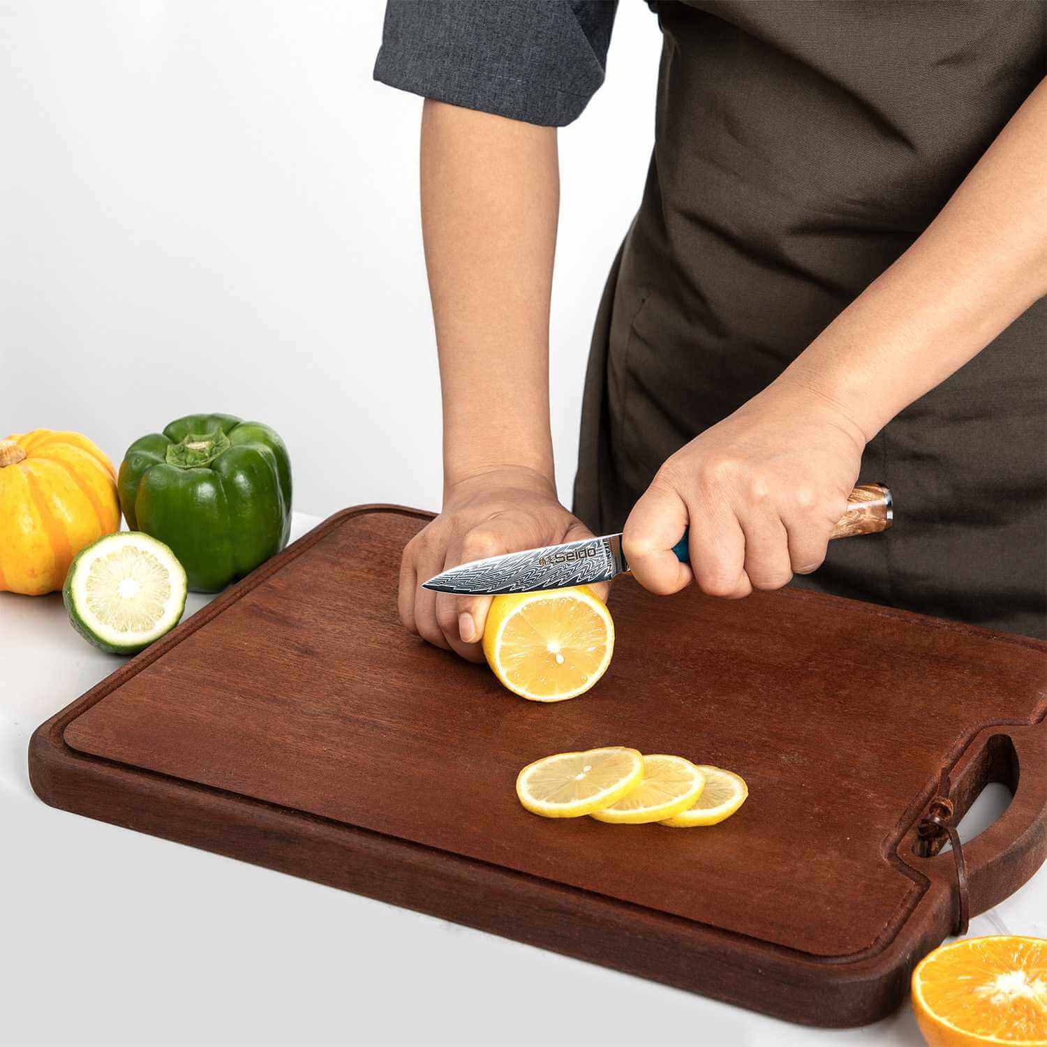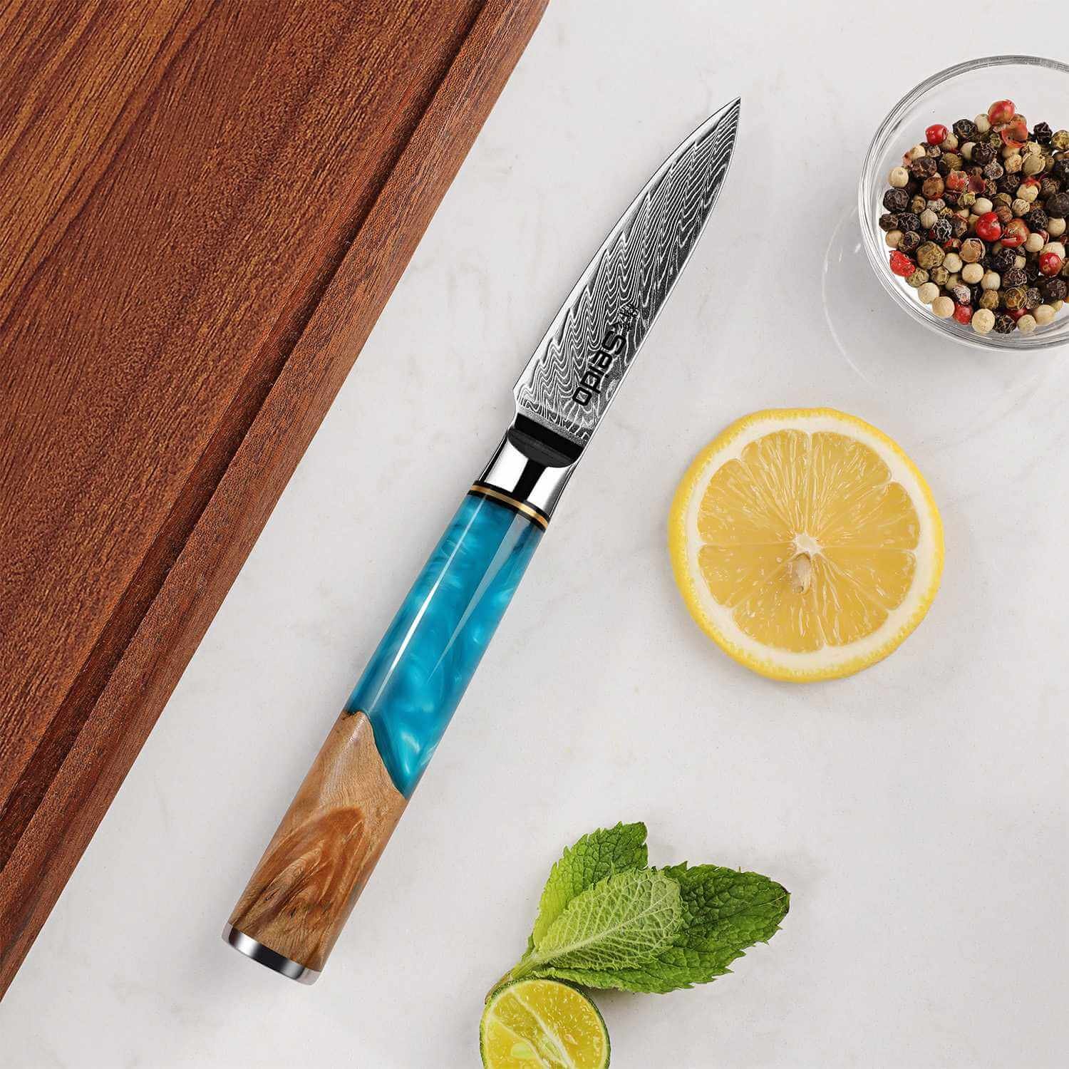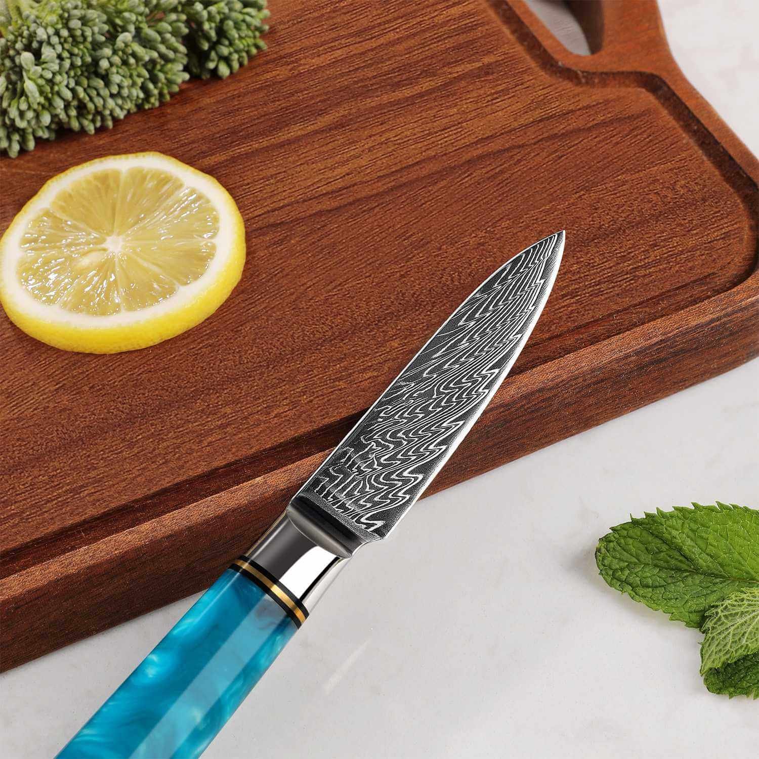Support from 8:30 AM to 10:00 PM everydayThe Executive Series 3.5 Damascus Paring Knife delivers unmatched precision for peeling. trimming. and fine prep work. Forged with a premium VG10 super-steel core and clad in 67 layers of Damascus. it combines razor sharpness with lasting durability. A polished resin–maple wood handle provides ergonomic comfort. balance. and executive-grade style — making this compact knife a kitchen essential for detail-oriented tasks.