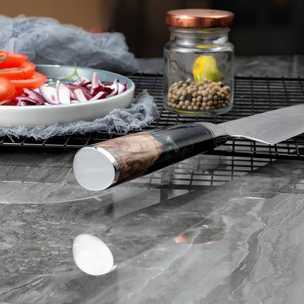 67 Layered Damascus steel with a VG-10 Super Steel core. The Japanese Executive Gyuto Chef Knife has an 8 / 210mm long razor sharp blade. from tip to heel and a distinct black resin. stabilized wood handle.