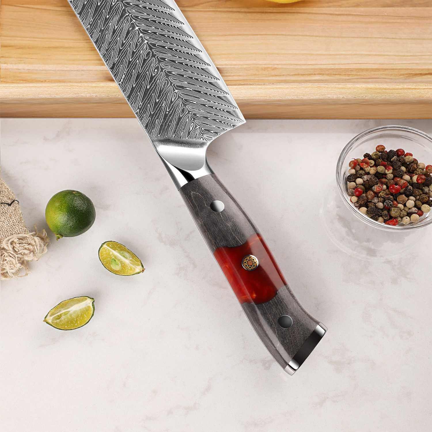 Support from 8:30 AM to 10:00 PM everydayMeet the Inferuno Series 7 Nakiri Knife — a Japanese vegetable cleaver engineered for precise push cuts. dicing. and chopping. Forged with an AUS-10 cutting core and clad in 73 layers of Damascus steel. this wide. flat-edged blade glides through produce with minimal resistance. The polished resin & maple handle ensures comfort. balance. and control. while its striking pattern embodies the spirit of Japanese craftsmanship.