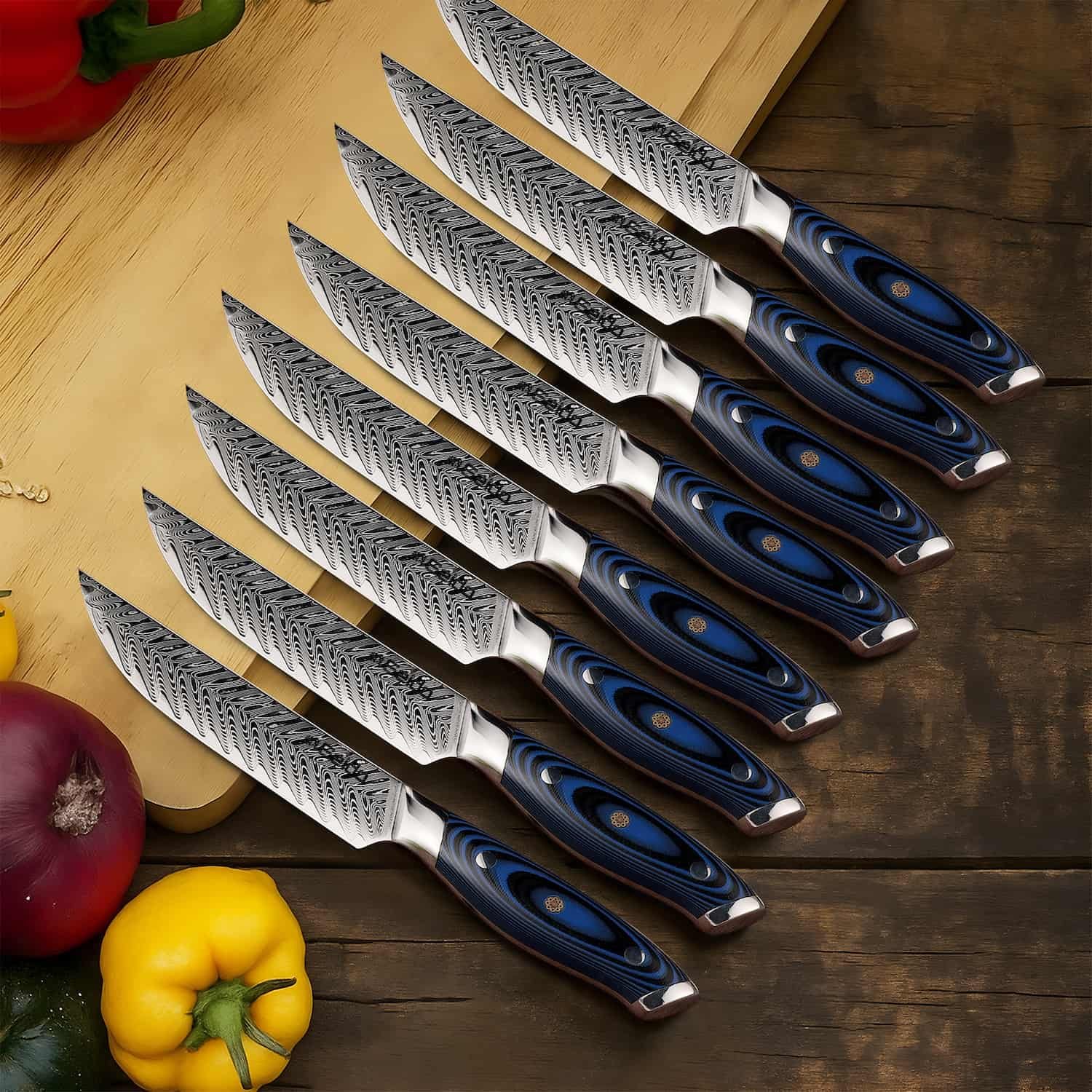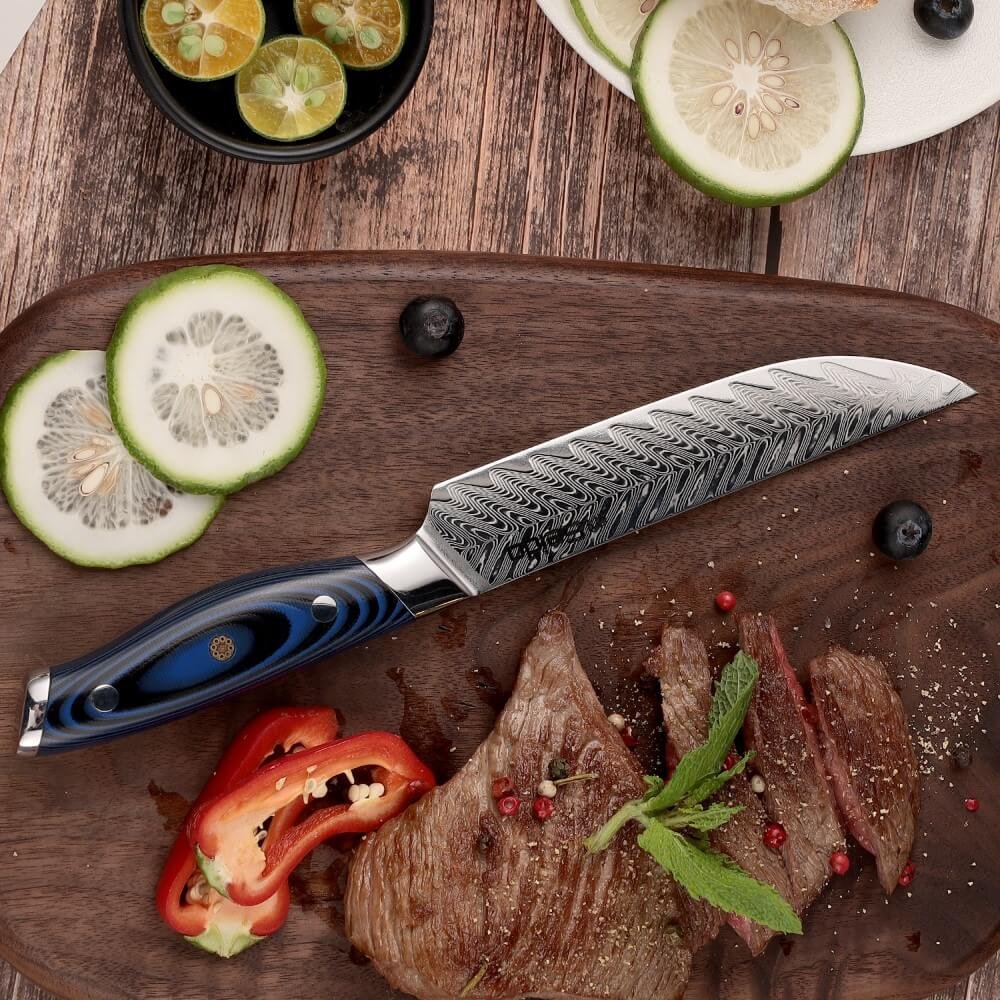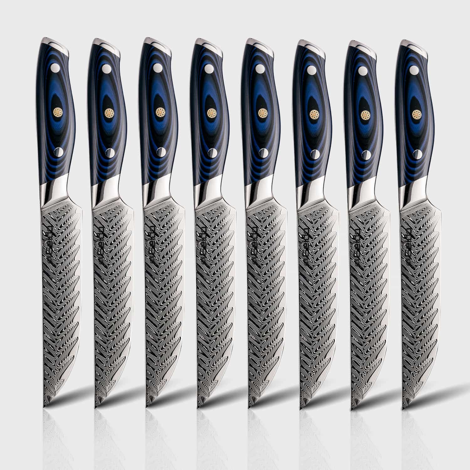Support from 8:30 AM to 10:00 PM everydayMeet the Kanpeki Straight-Edge Steak Knives — precision table knives built on a razor-keen VG-10 steel core with a striking 67-layer Damascus finish. The contoured blue/black G10 handles with Seido mosaic pins deliver confident grip and balance. Enjoy clean. glide-through cuts that preserve juices and texture.