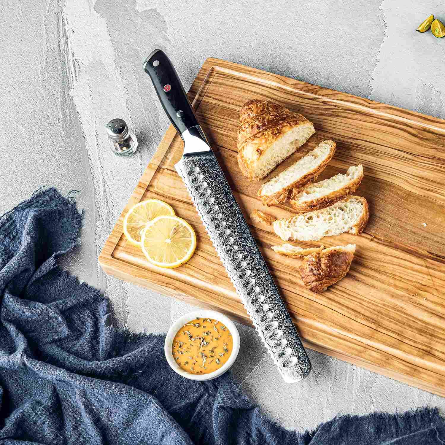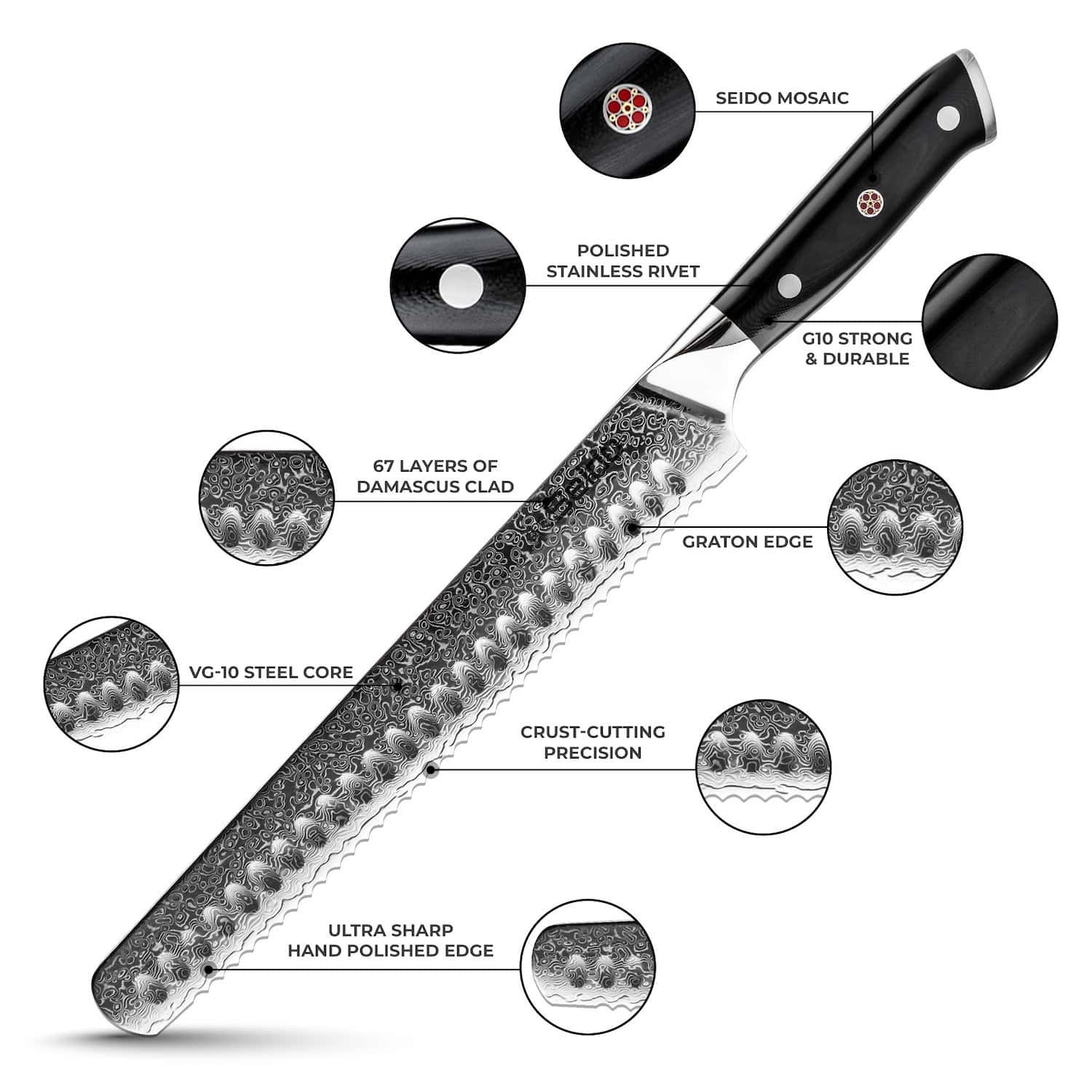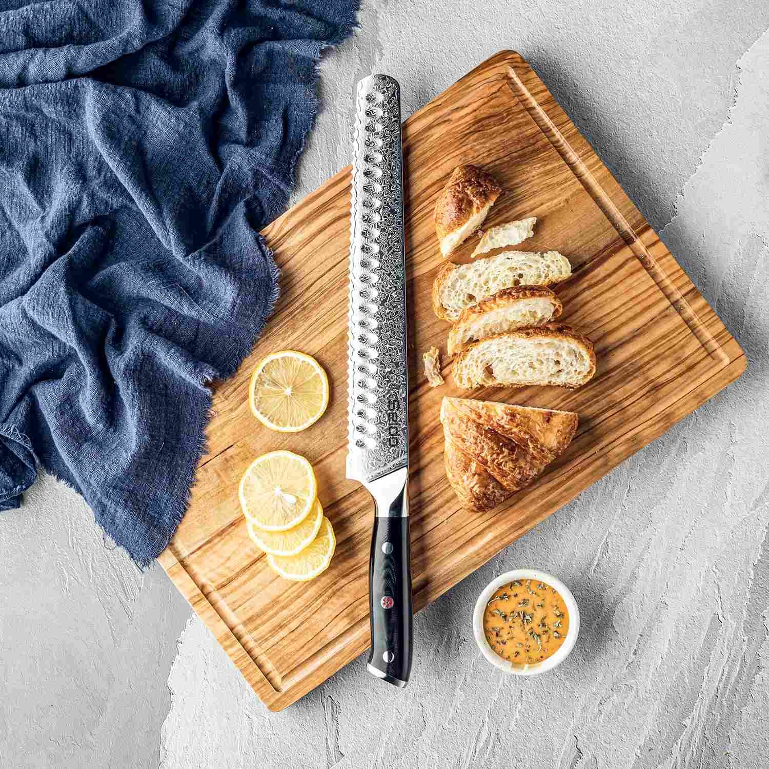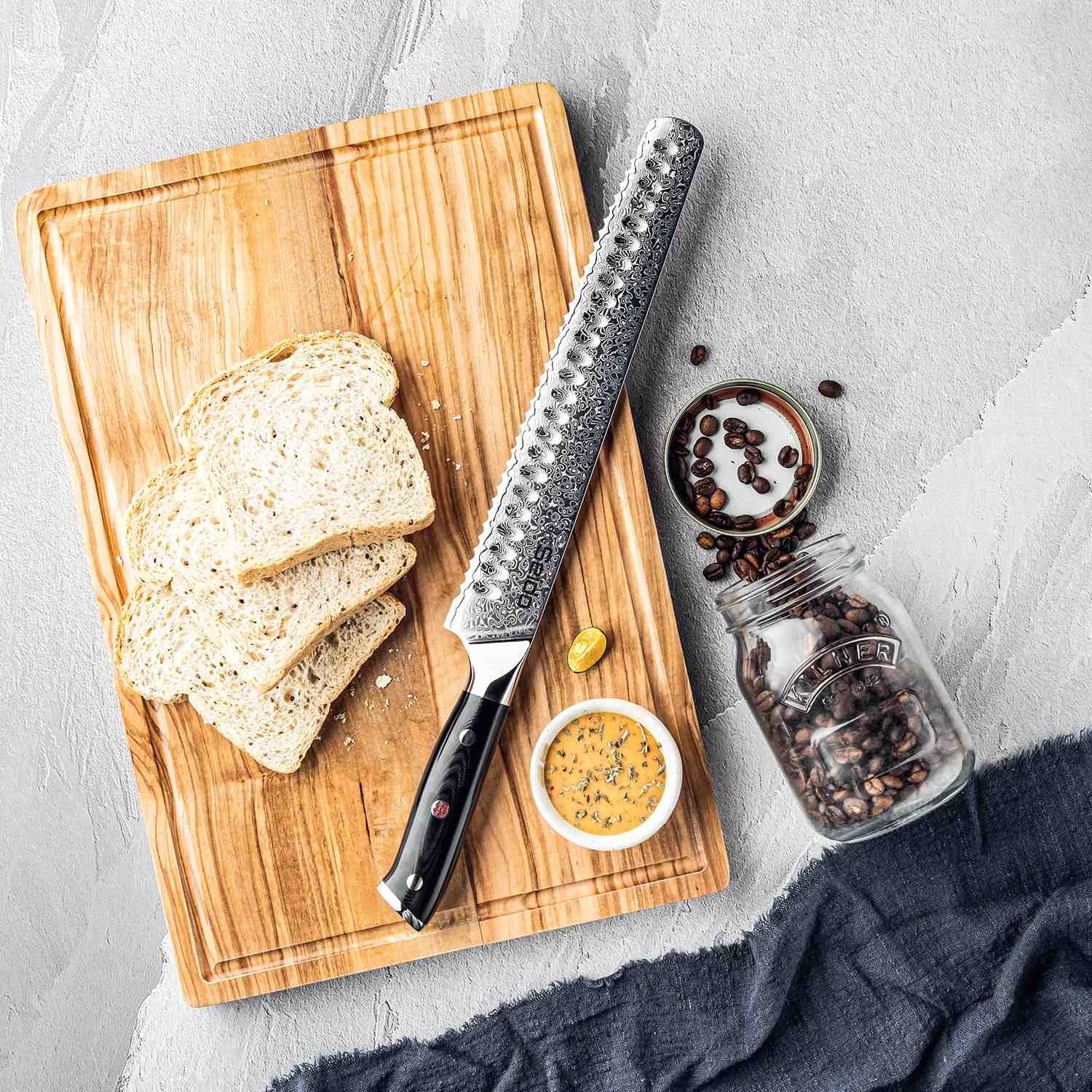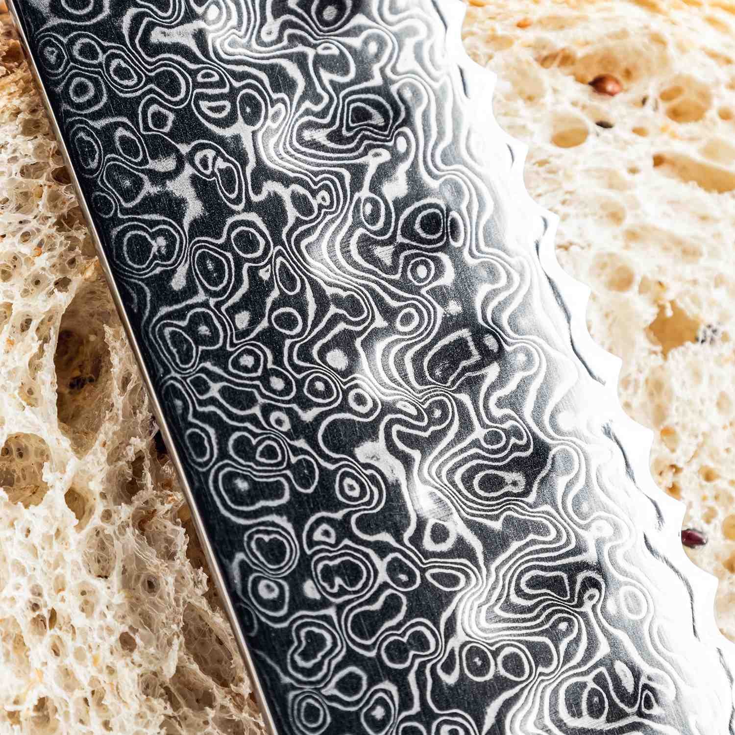 Arrives nested in a protective gift box. The long. serrated edge bites cleanly into crust while the Damascus cladding reduces sticking. A comfortable. moisture-resistant G10 handle stays secure wet or dry.