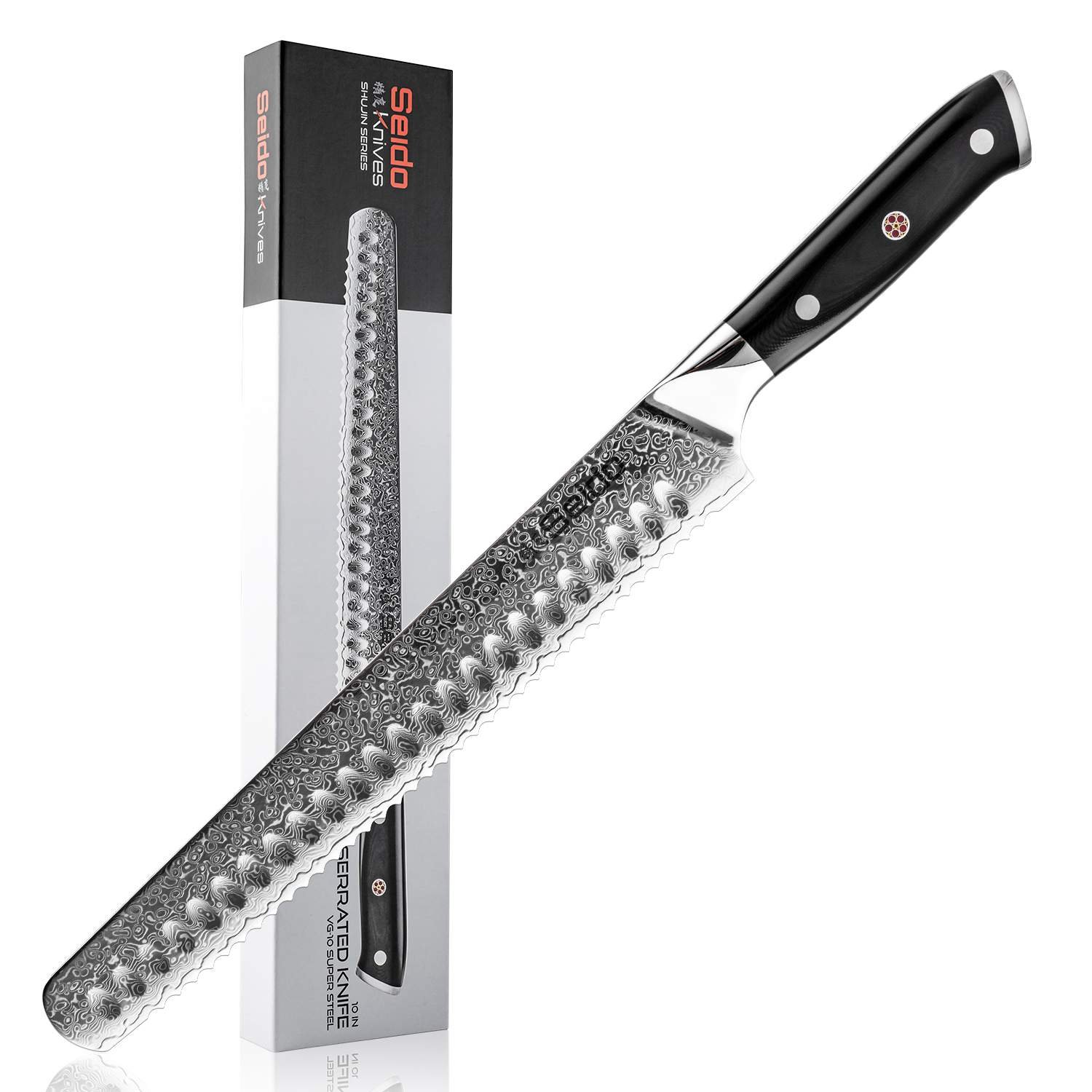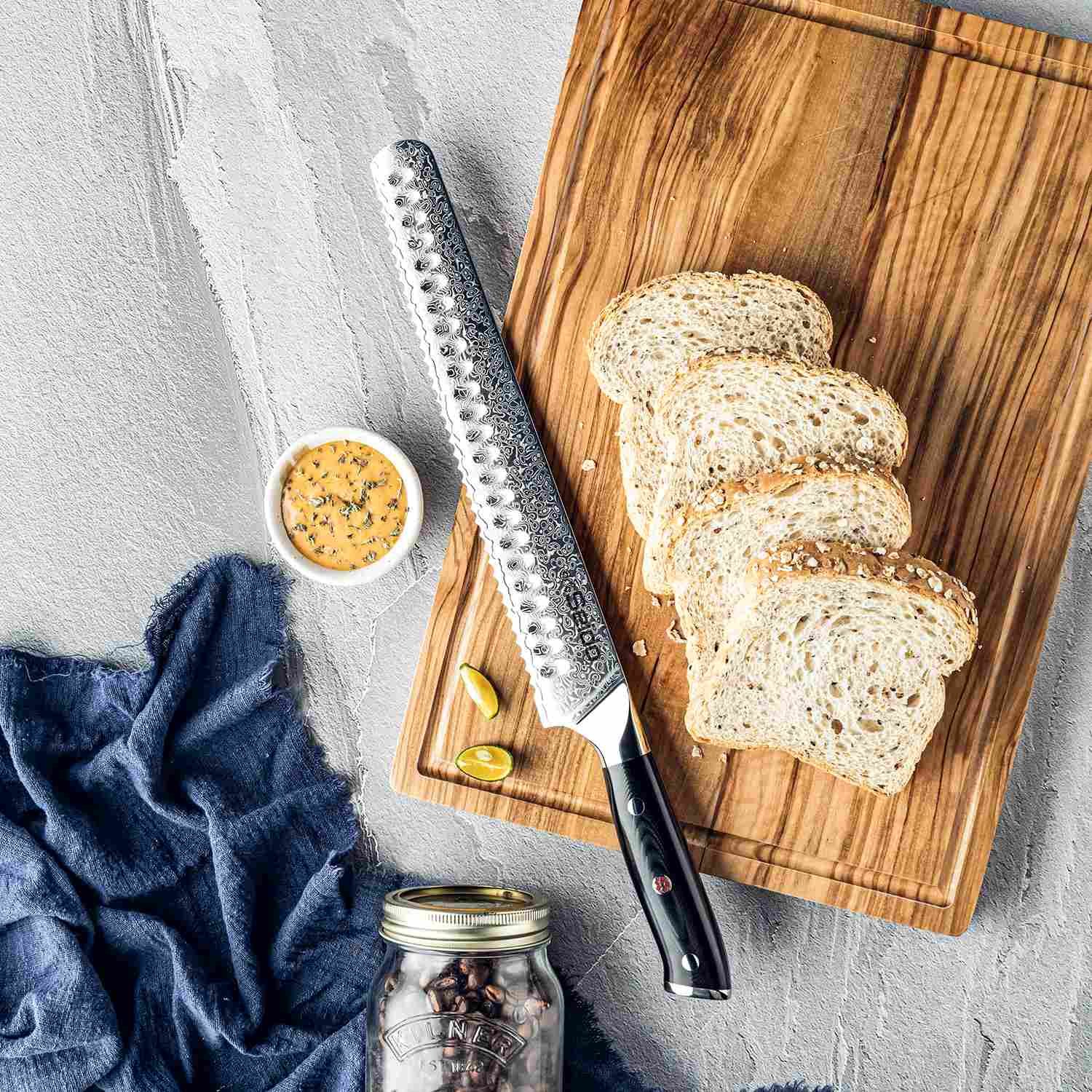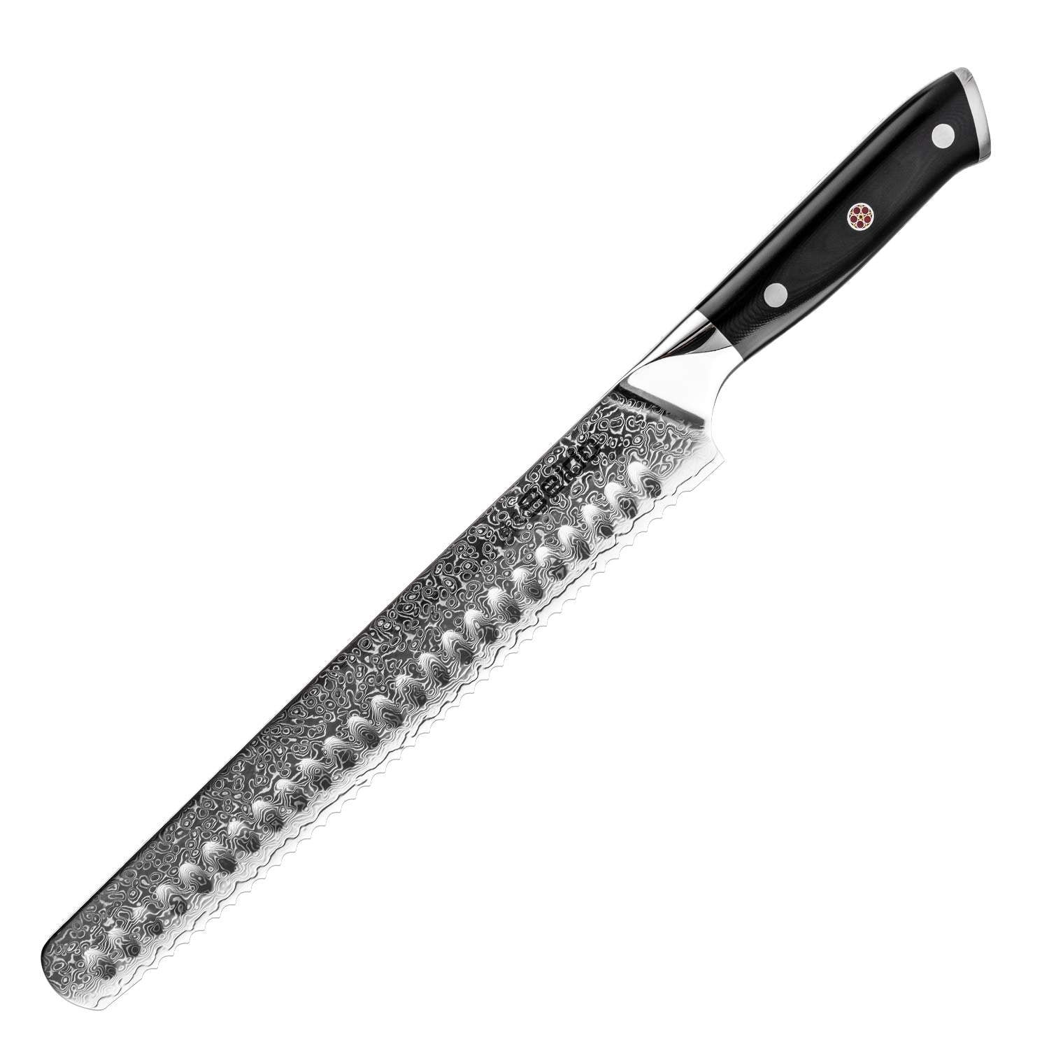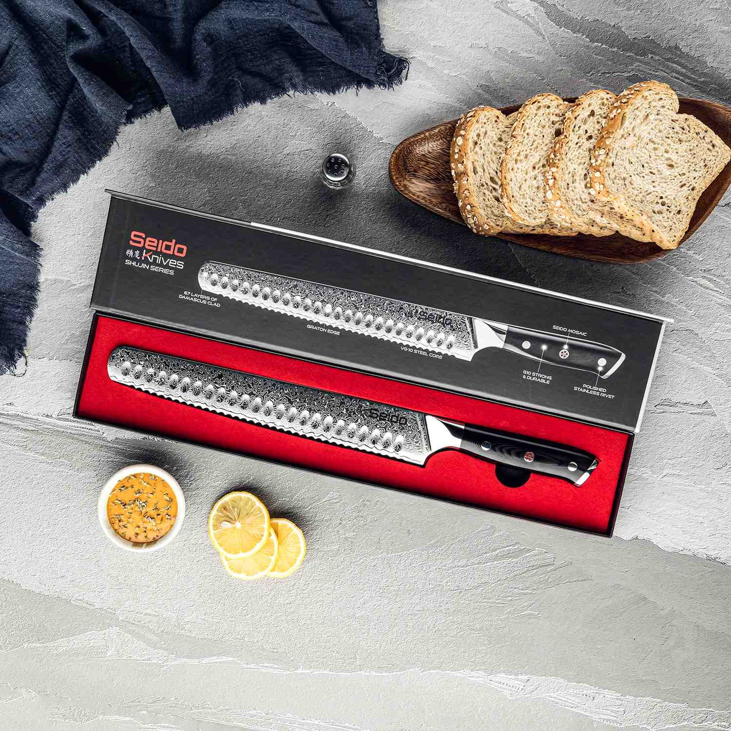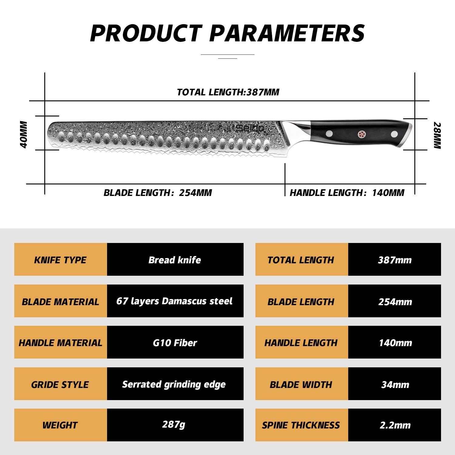 Arrives nested in a protective gift box. The long. serrated edge bites cleanly into crust while the Damascus cladding reduces sticking. A comfortable. moisture-resistant G10 handle stays secure wet or dry.