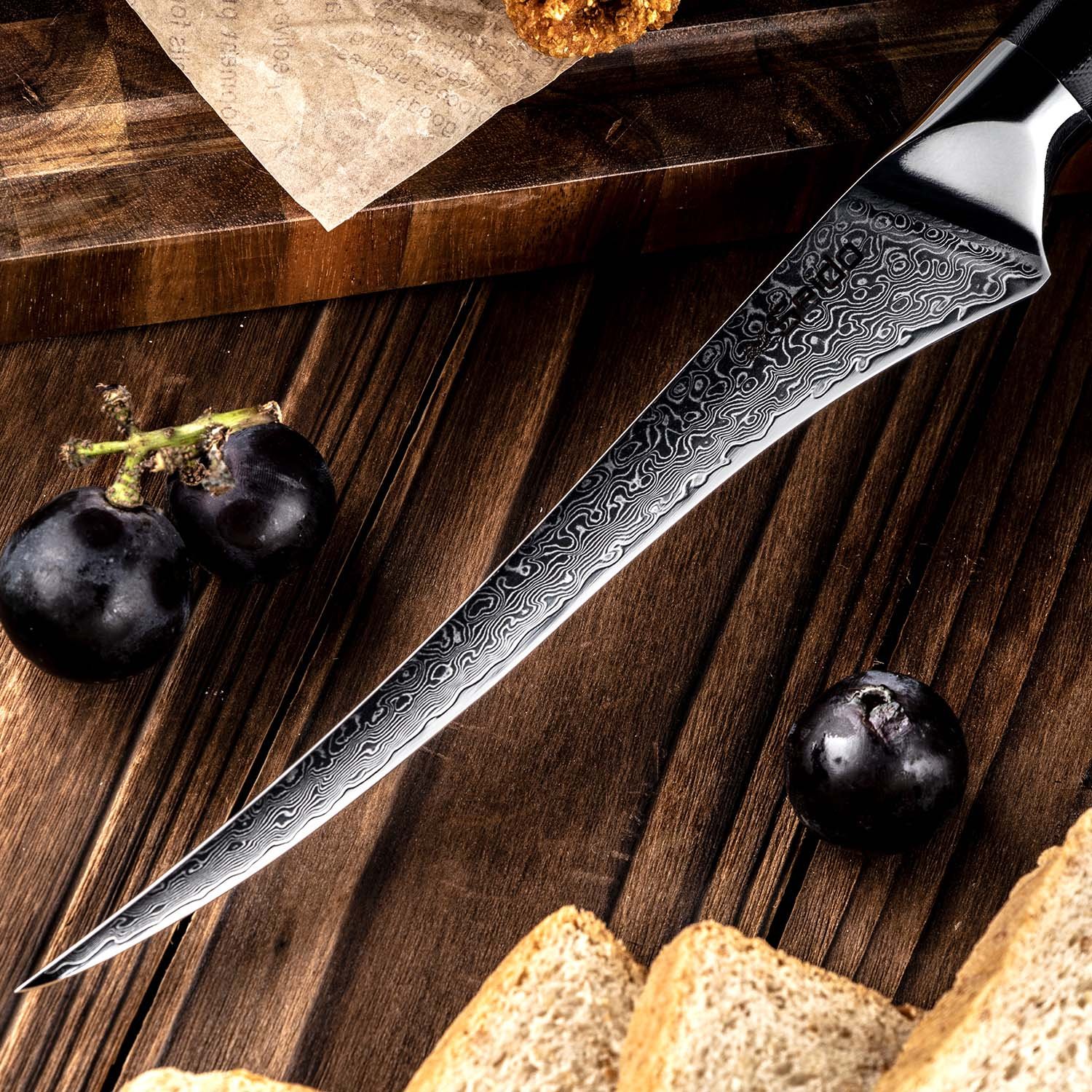 Support from 8:30 AM to 10:00 PM everydayElevate your filleting skills with the Shujin Series 7.5 Fillet Knife. crafted for unparalleled precision and flexibility. This knife features a VG-10 super steel cutting core and is encased in premium high-carbon stainless steel cladding. providing a razor-sharp edge and exceptional durability. The 67-layer Damascus steel blade ensures effortless performance. perfect for delicate tasks like removing bones and skinning fish.