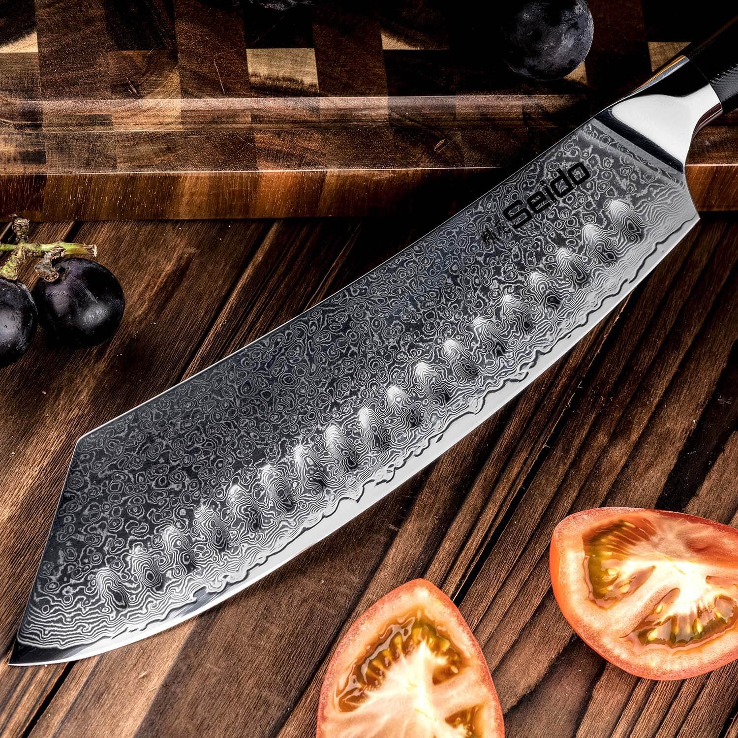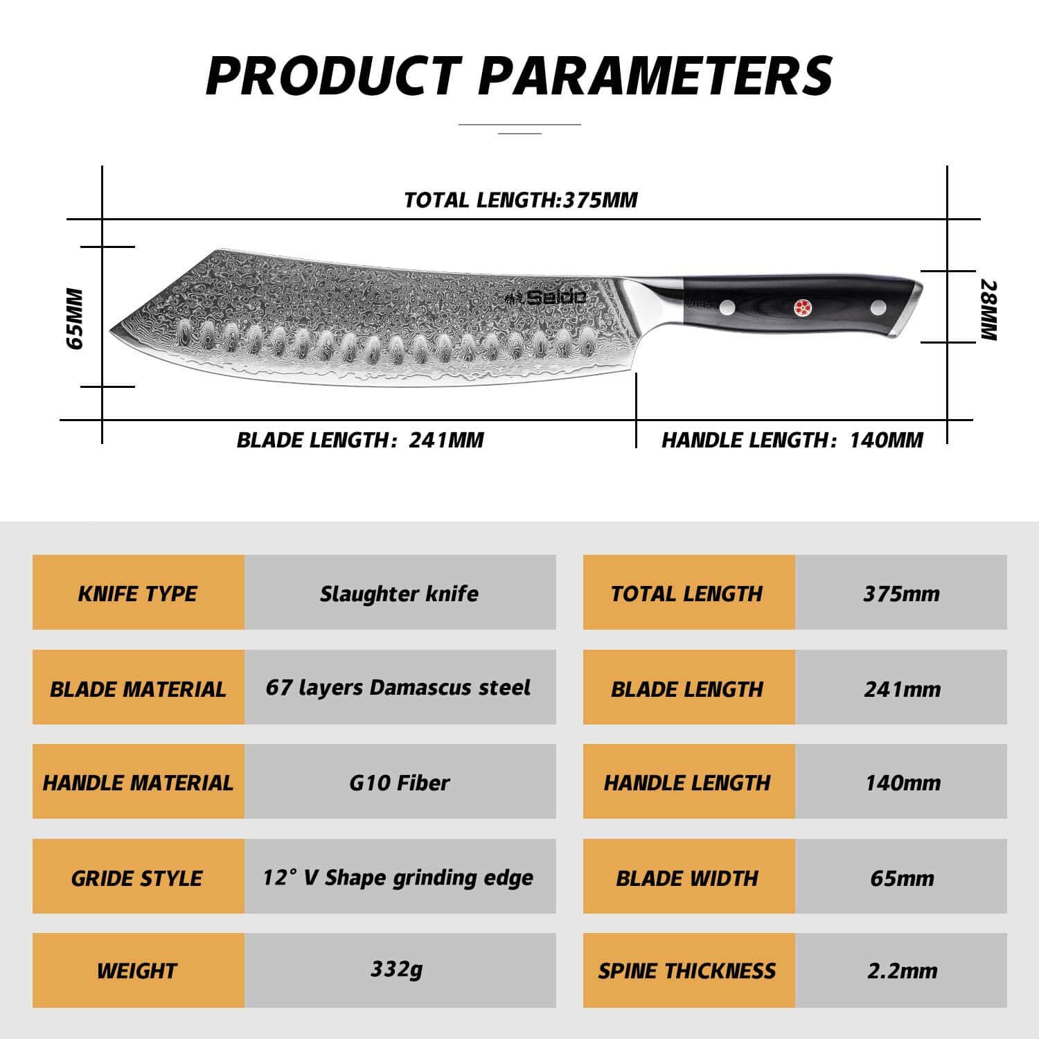 Support from 8:30 AM to 10:00 PM everydayIntroducing the Shujin 9.5-Inch Slaughter Knife. a masterfully crafted tool designed for serious butchering tasks and precision slicing. Featuring a VG-10 super steel cutting core encased in 67 layers of Damascus steel. this knife offers exceptional sharpness and edge retention. The granton edge enhances slicing efficiency by reducing friction and preventing meat from sticking to the blade. ensuring clean. effortless cuts. Whether you’re breaking down whole carcasses or preparing large roasts. this slaughter knife is your go-to tool for heavy-duty kitchen tasks.