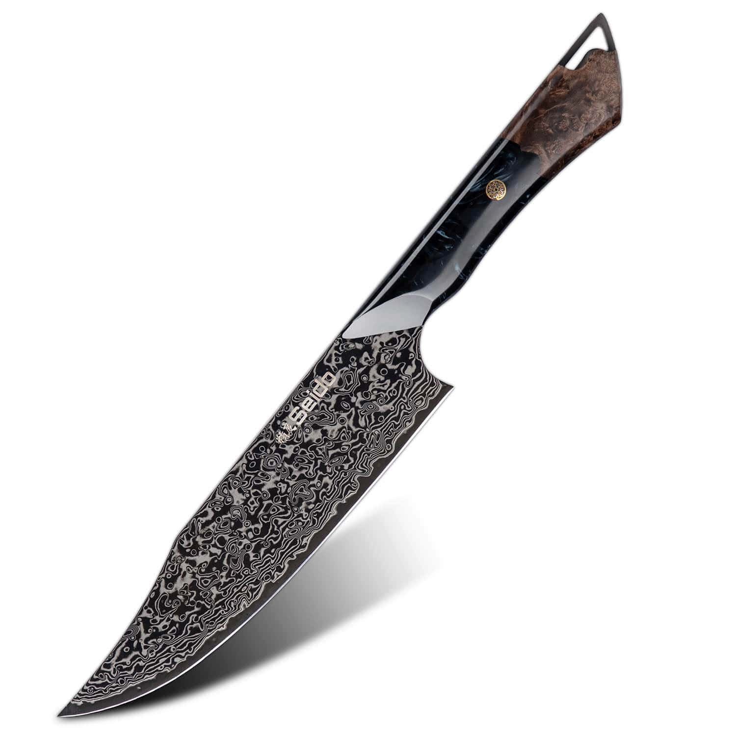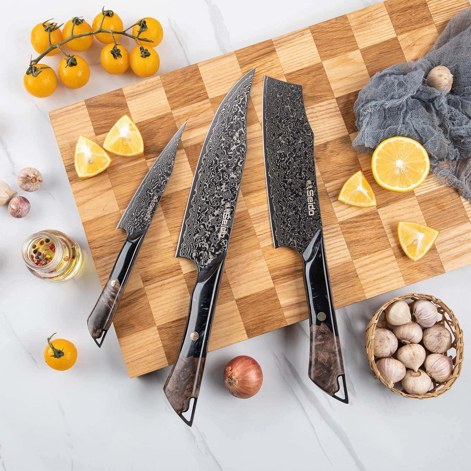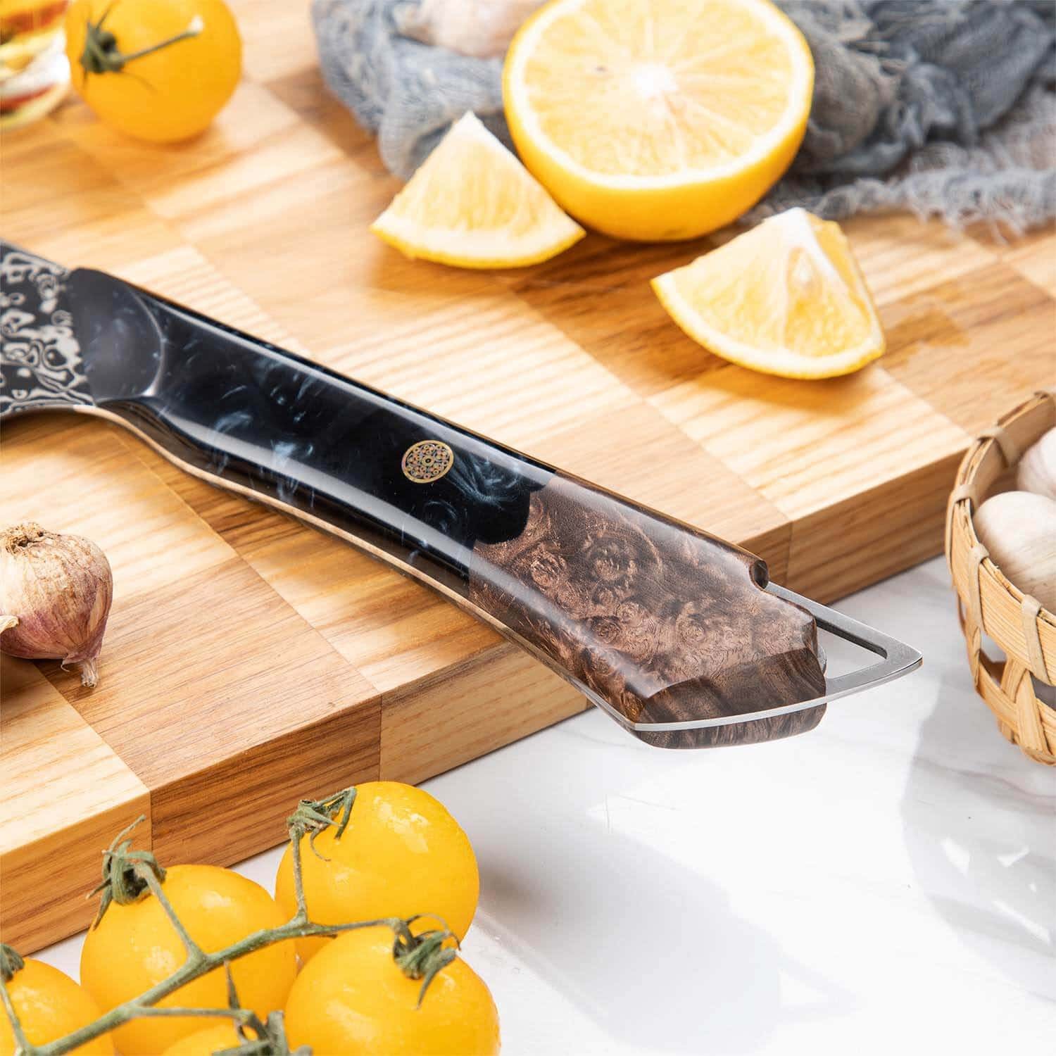 The Titan Chef. Nakiri. and Petty knives in this set feature unique and original designs like no other. The full-tang handles are crafted from black resin and marble-stabilized wood. providing an ergonomic grip with a luxurious aesthetic. This set is not only a functional kitchen toolset but a statement of elegance and precision. making it perfect for both professional chefs and home cooks alike.