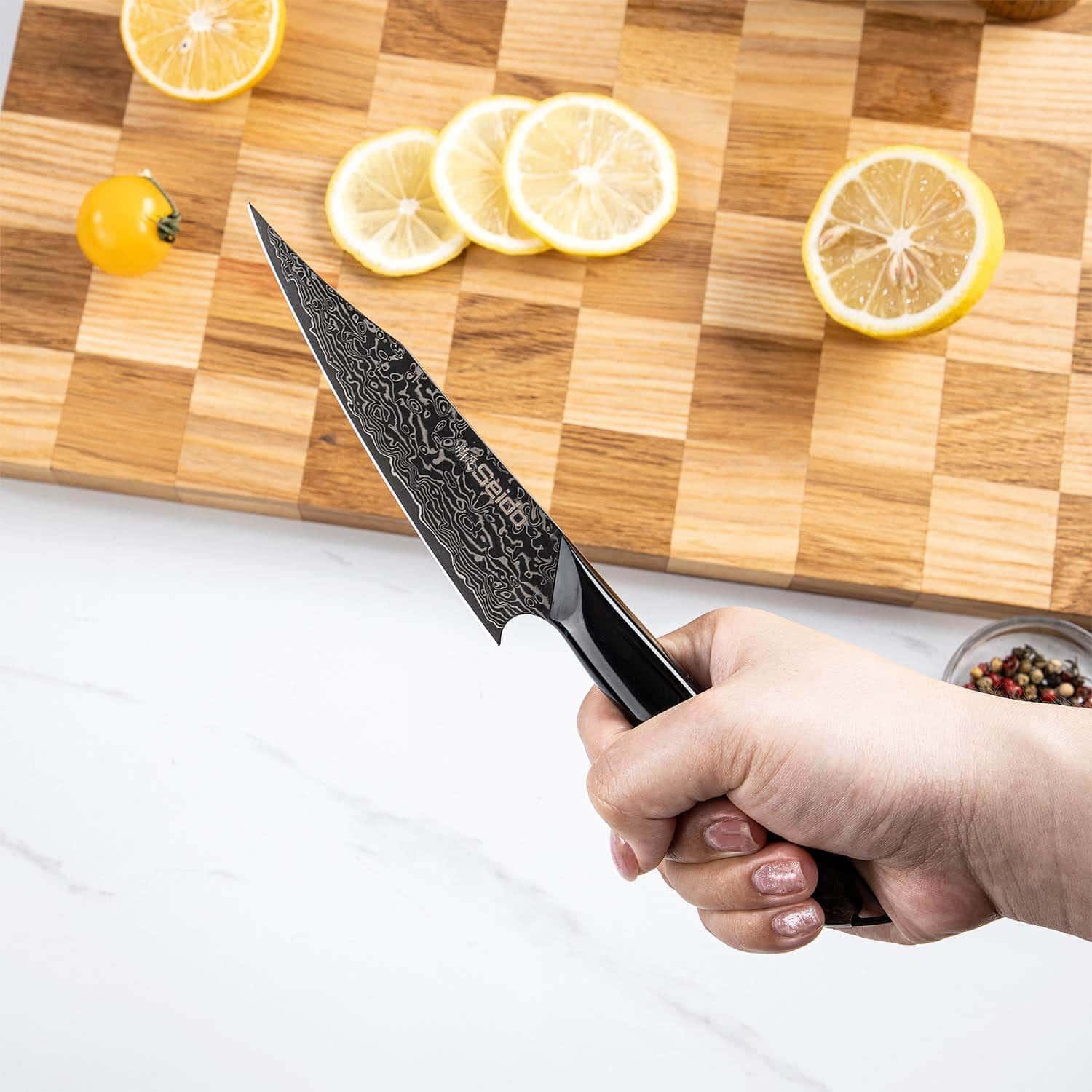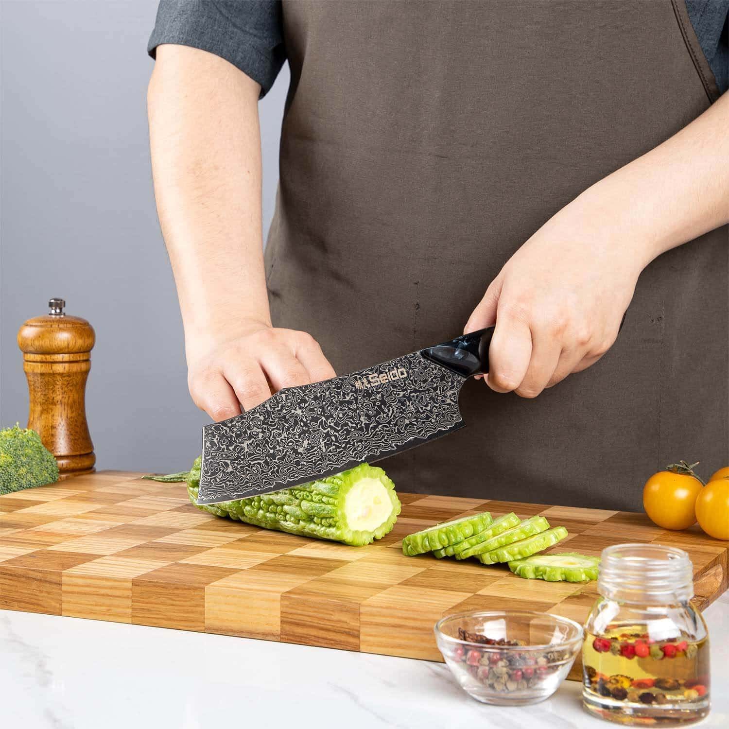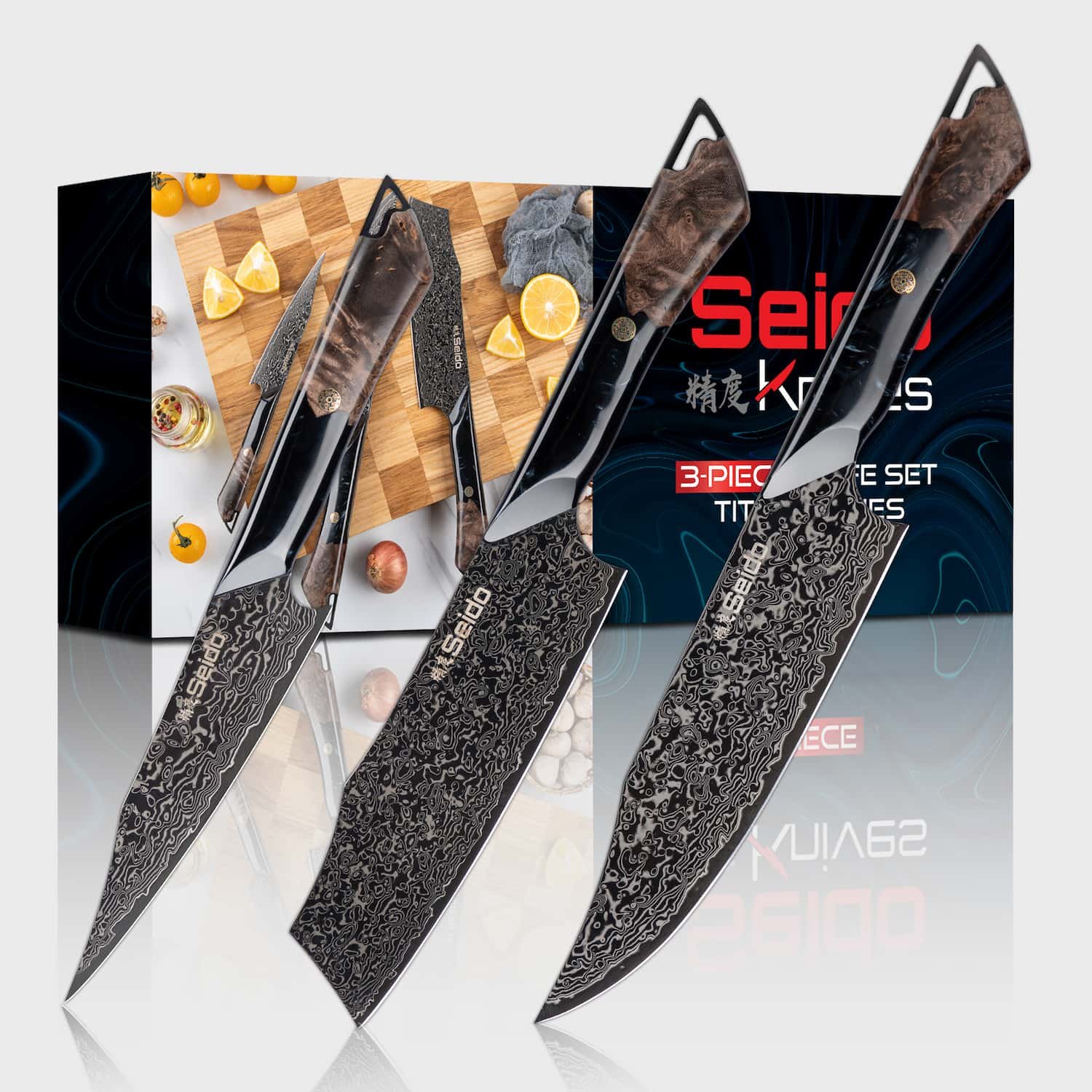 The Titan Chef. Nakiri. and Petty knives in this set feature unique and original designs like no other. The full-tang handles are crafted from black resin and marble-stabilized wood. providing an ergonomic grip with a luxurious aesthetic. This set is not only a functional kitchen toolset but a statement of elegance and precision. making it perfect for both professional chefs and home cooks alike.